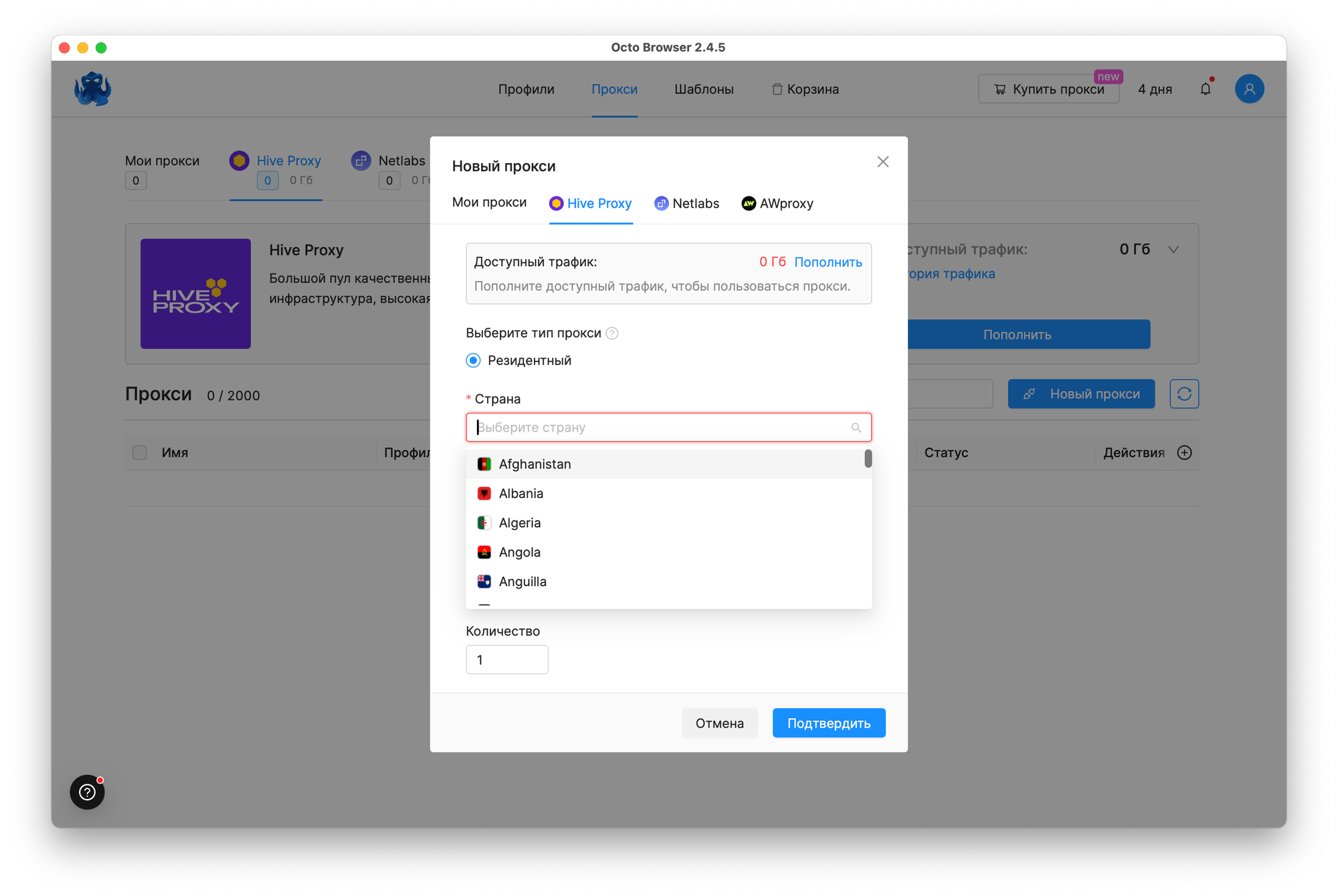 Если у вас нет своего прокси, его можно приобрести через одного из партнёров. Список партнёров, стран и прочие параметры доступны прямо в приложении. Хочу отметить, что есть резидентные прокси.