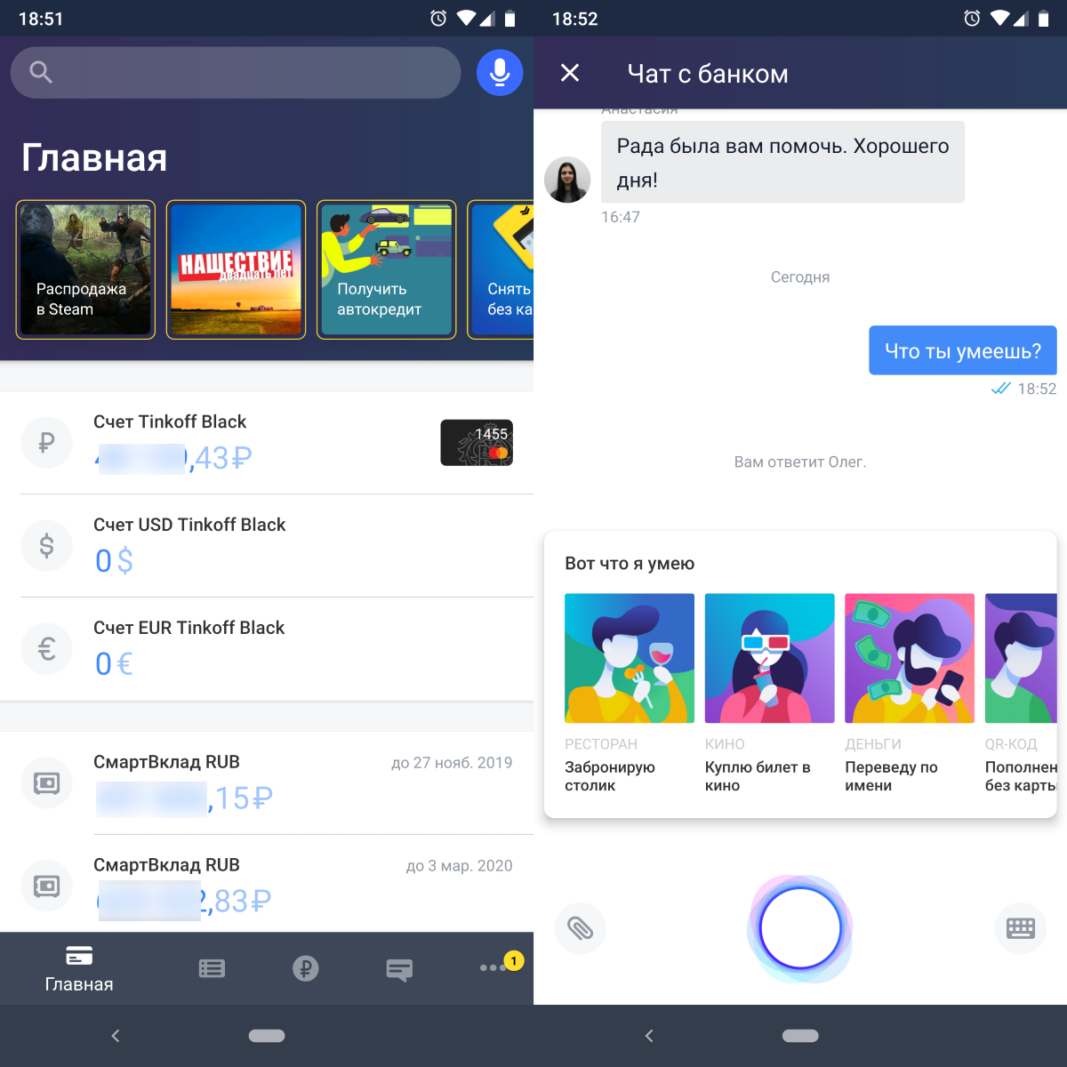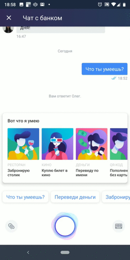 Голосовой помощник доступен в последних версиях приложения Тинькофф на iOS и Android. Для активации надо нажать на микрофон рядом с поиском или сказать «Привет, Олег». Вызвать помощника при закрытом банковском приложении нельзя. А жаль.