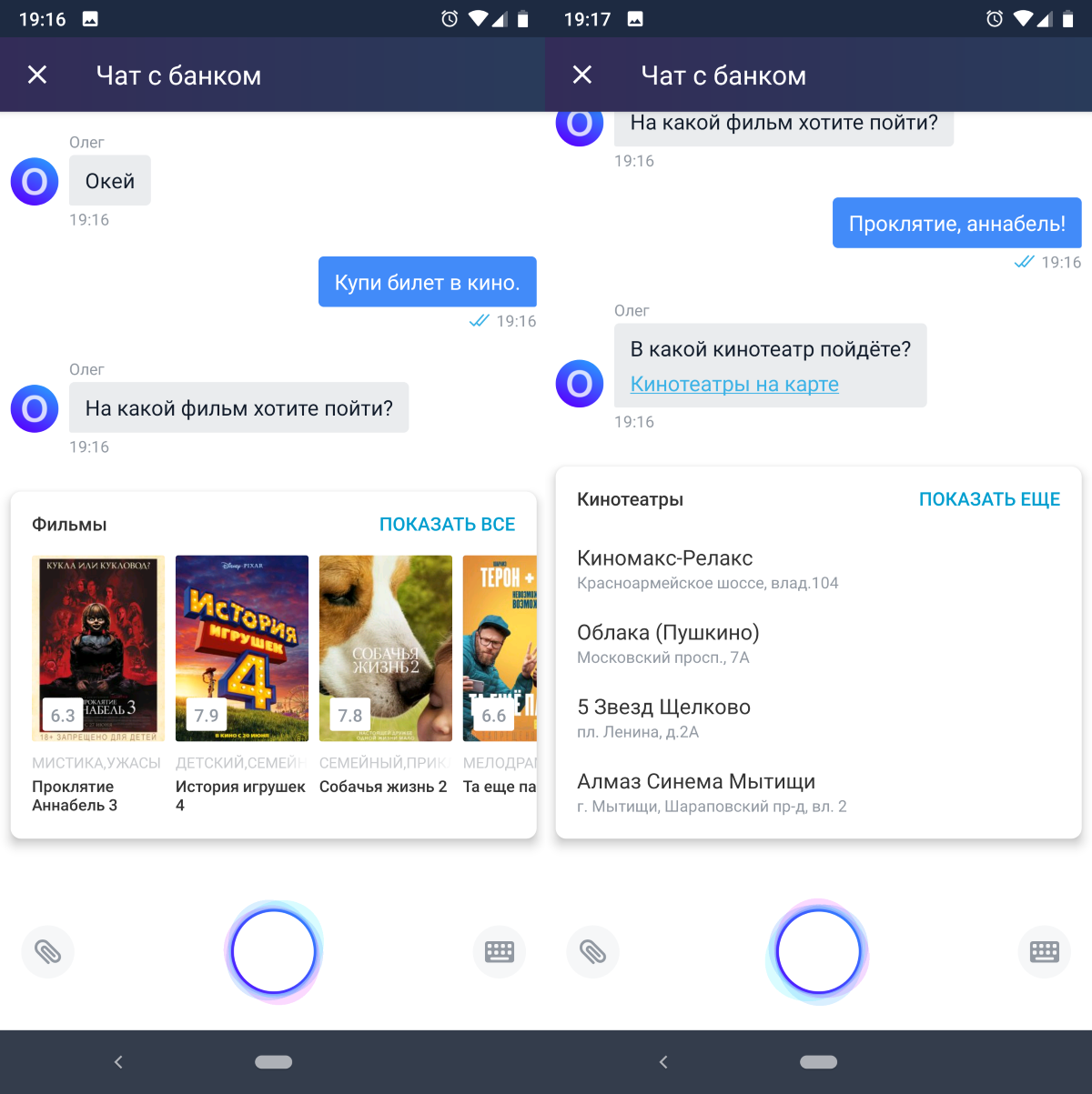 Купить билеты в кино наоборот можно через приложение, но не через Олега. Он мне почему-то предлагает кинотеатры Москвы.
