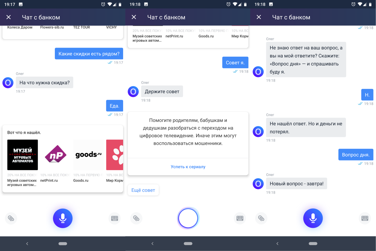 Ну и другие функции не работают. На запрос скидок на еду мне предложили музей игровых автоматов и корм для животных. Совет дня отработал ещё более или менее, а вот вопрос дня попросили ждать до завтра.