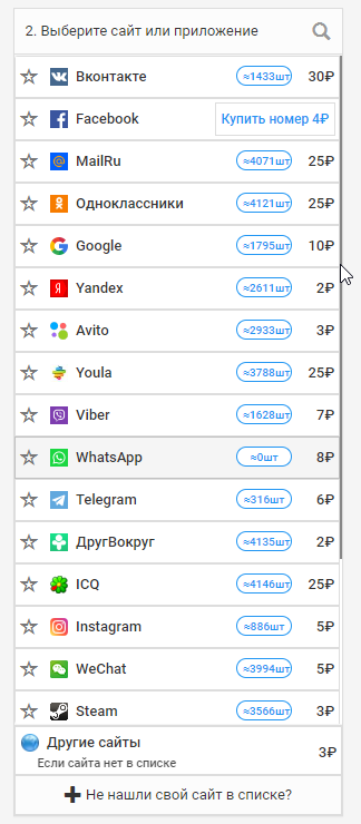 Затем необходимо выбрать сайт или приложение, для которого нужно получить SMS. В списке около 15 популярных сервисов, включая ВКонтакте, Viber, Telegram, Юла. Либо можно выбрать опцию «Другие сайты», если подходящего сервиса нет.