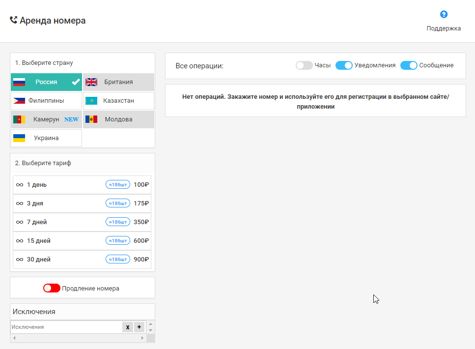 В разделе «Аренда номера» всё работает точно так же. Отличие только в количестве доступных стран. Также нет выбора сервисов, но это и не нужно. Номера принимают сообщения ото всех поддерживаемых сервисов.