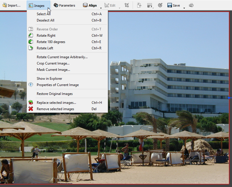 Приложение сразу не производит никаких действий над добавленными изображениями. Через меню вы можете произвести какие-то базовые правки фотографий: поворот, отражение, обрезка, добавление маски. Либо сразу же выбрать создание обычной или 360 панорамы.