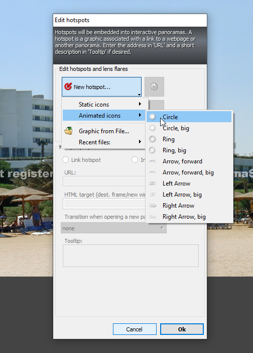 Чтобы добавить интерактивные элементы, нужно нажать кнопку «Hotspots». В специальном редакторе можно выбрать тип иконки и действие, которое должно выполняться при нажатии на неё.