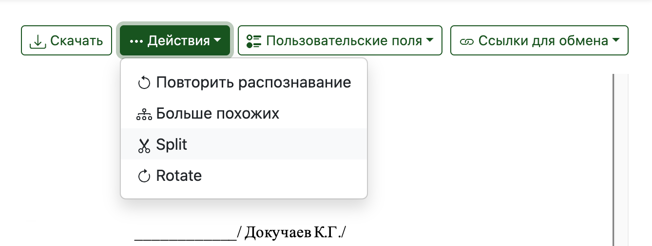 Есть ещё метаданные, примечания и история обработки документа, но это уже не так интересно. А вот что интересно, так это возможность сразу найти похожие документы, разделить файл или поделиться им с помощью ссылки.