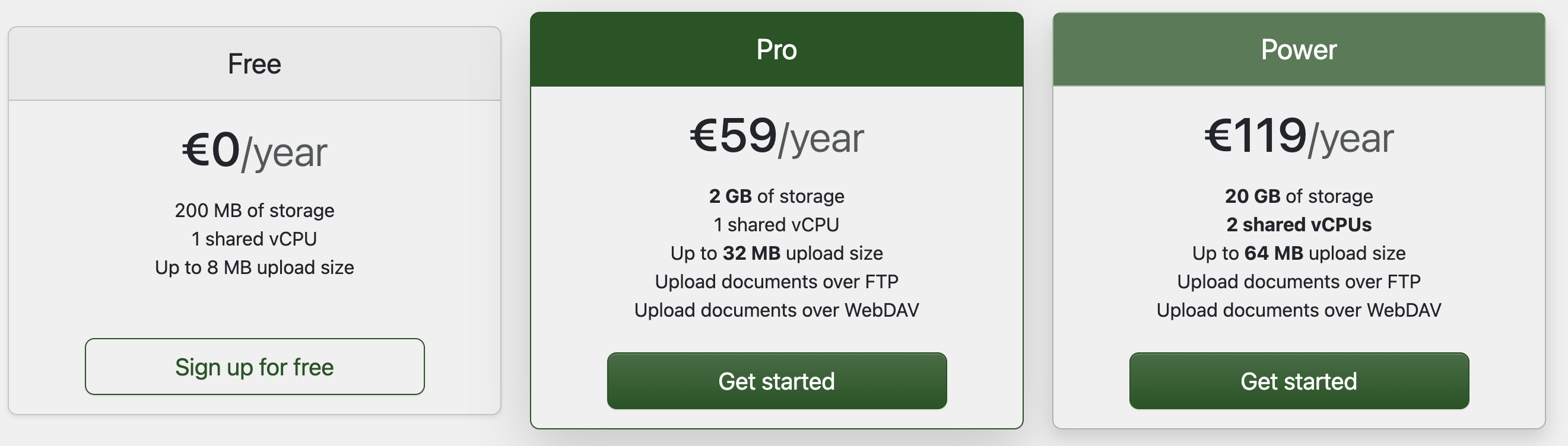 Платные тарифы начинаются от €59 евро в год. Сами тарифы отличаются лишь объёмами. Также только на платных тарифах есть импорт документов и работа по FTP и WebDav.