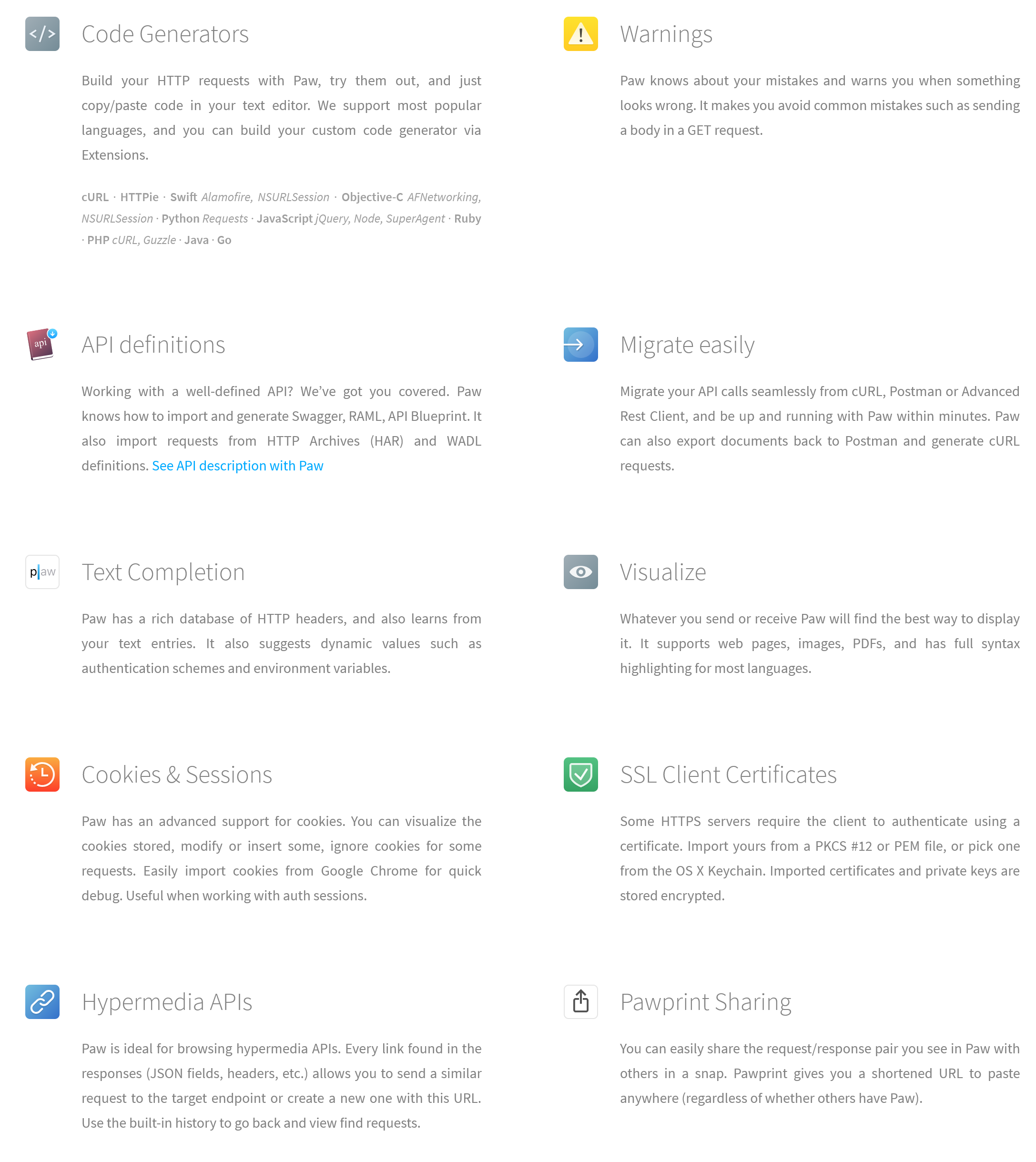 Paw — Mac-приложение для работы с API различных веб-сервисов и приложений. Где сразу встроен HTTP-клиент для отправки самых различных запросов, удобно работать с API и есть возможность командной разработки.