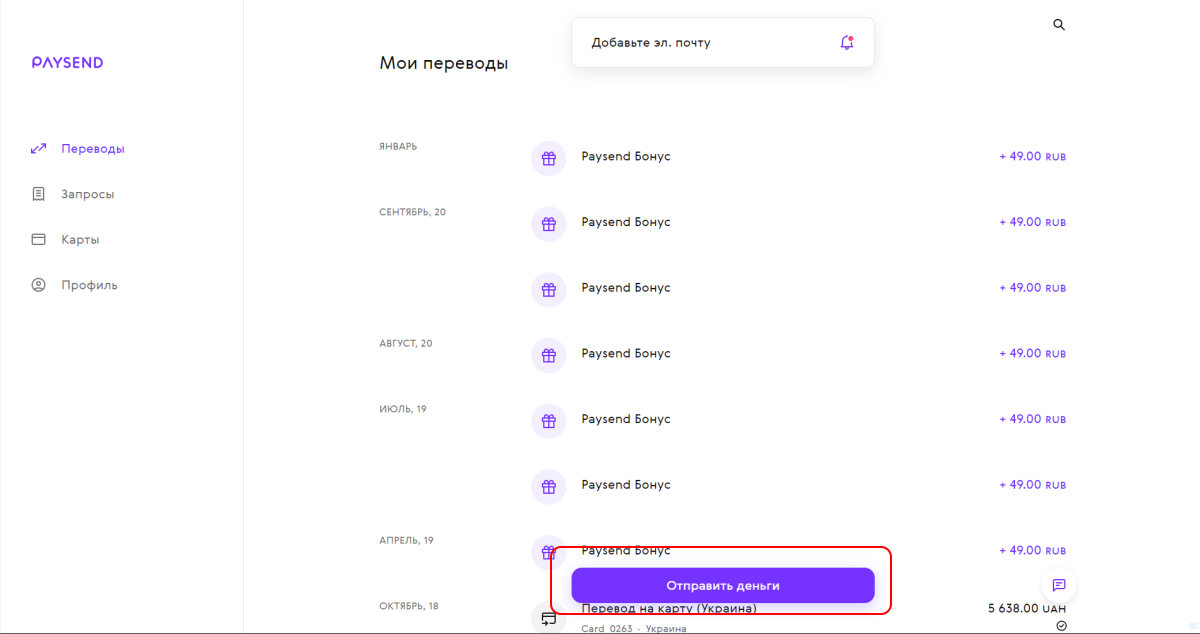Воспользоваться Paysend можно с помощью веб-сайта или мобильного приложения. На сайте для этого есть два основных раздела: Переводы и Запросы.