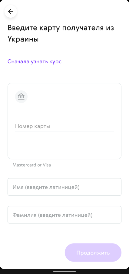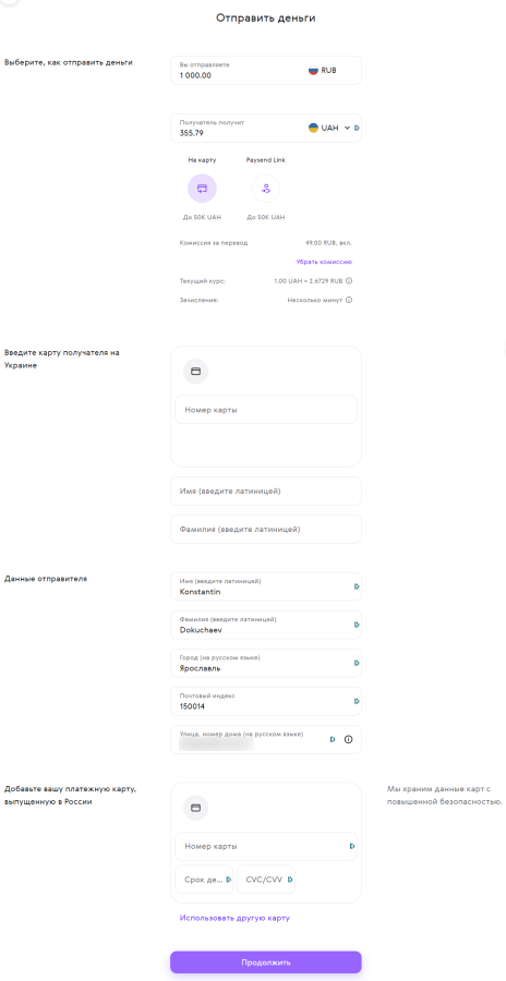 Если был выбран перевод на карту, нужно будет заполнить поля с номером карты и именем и фамилией получателя. Аналогично нужно будет указать данные и вашей карты.