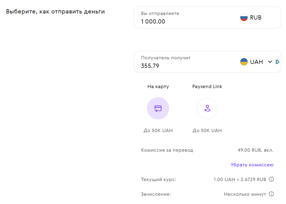 У Paysend фиксированная комиссия за перевод. То есть — отправляете вы 1 000 рублей или 10 000 — за перевод вы всё равно заплатите 49 рублей.
