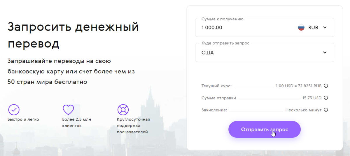 Аналогично (но в обратном порядке) работает запрос денег. Вы указываете сумму, которую нужно получить, и страну, откуда нужно совершить перевод.