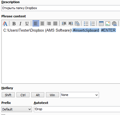 У нас на работе не у всех одинаковые локальные пути в папке Dropbox. Поэтому, когда мне дают путь к локальной папке, я копирую ту часть, которая у нас 100% одинаковая, а в проводнике ввожу "!Drop". PhraseExpress набирает, мою часть пути к локальной папке, набирает скопированную часть пути и автоматически жмет Enter. Так у меня сразу же открывается правильная папка.