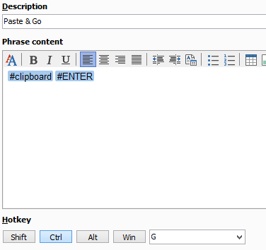 По нажатию Ctrl+G PhraseExpress вставляет скопированный путь и нажимает Enter. Так у меня сразу же открывается нужная папка.