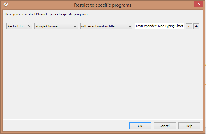 Здесь вы указываете не просто в каких программах данный триггер сработает, но и какой заголовок окна должен быть у этой программы. В моем случае сниппет будет выполнени только в Chrome. Если я наберу "!Тест", например, в Evernote, то ничего не произойдет.