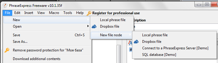 Автоматическая синхронизация базы между компьютерами происходит через Dropbox (опция доступна при установленном приложении) или через компьютер-сервер. Для этого при создании своей первой базы нужно в опциях выбрать соответствующий тип базы. После этого PhraseExpress автоматически будет подхватывать все изменения с других компьютеров. Автонабор, автокорреция и буфер обмена не синхронизируются.