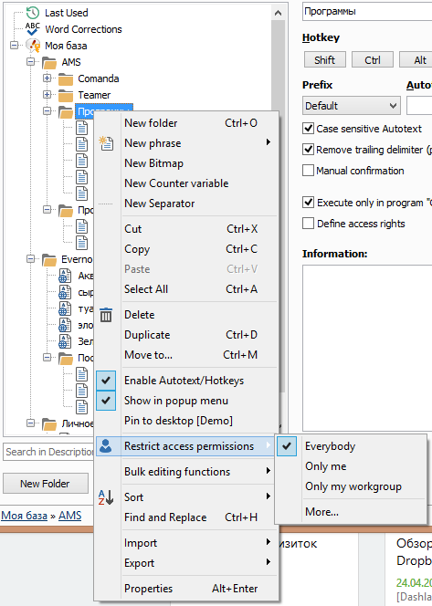 Одна из интересных особенностей утилиты - это разделение прав на доступ к сниппетам. Вы можете указать какой пользователь компьютера имеет доступ к определенным сниппетам. Для этого вам нужно выбрать раздел сниппетов, затем в меню выбрать Restrict Access и выбрать нужных пользователей. Плюс саму базу можно защитить паролем.