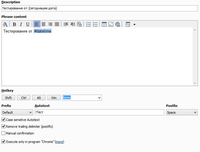 В разделе Phrase content указан сам сниппет, который будет выполняться. В моем случае - это набор неформатированного текста с добавлением макроса даты.