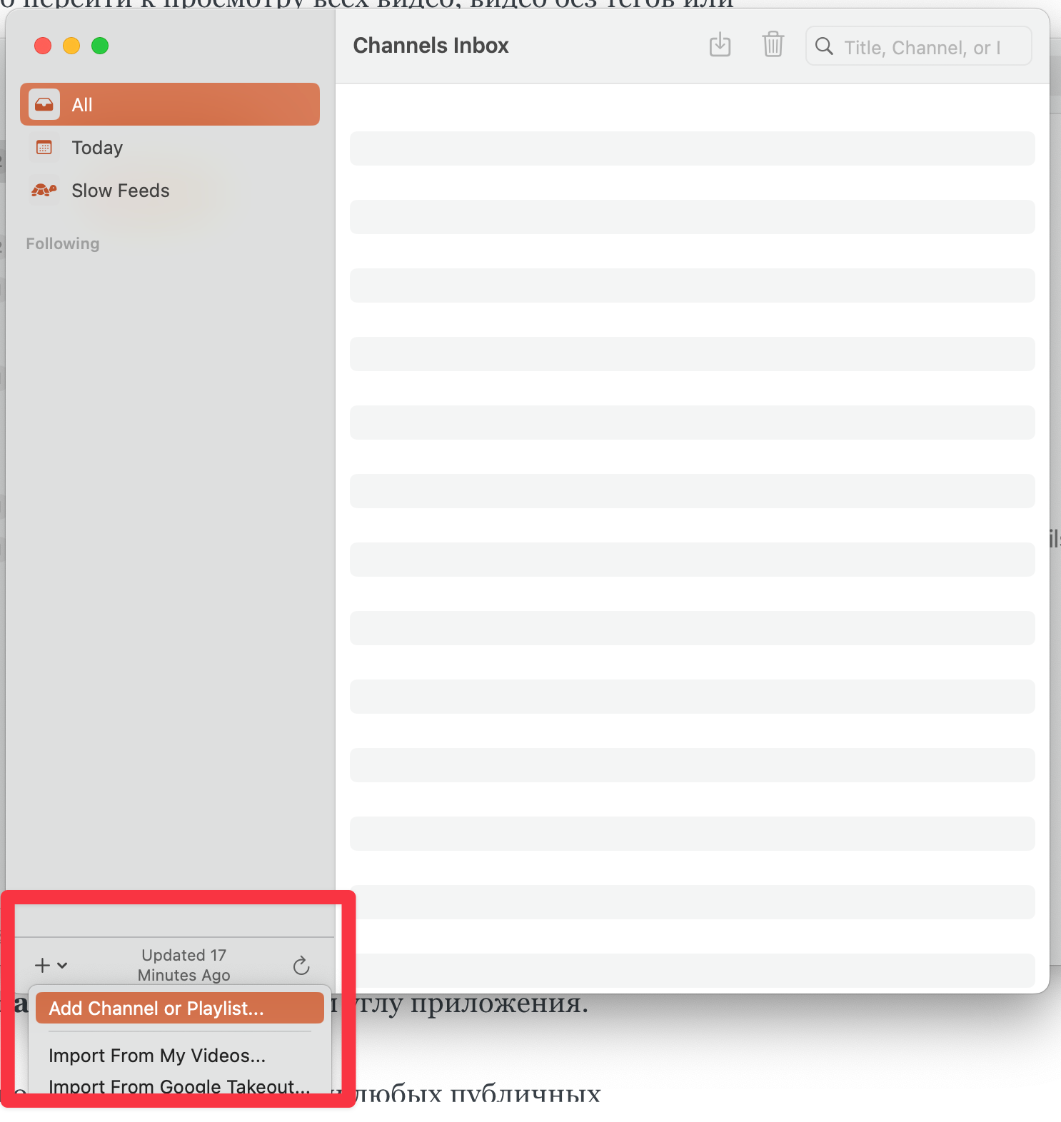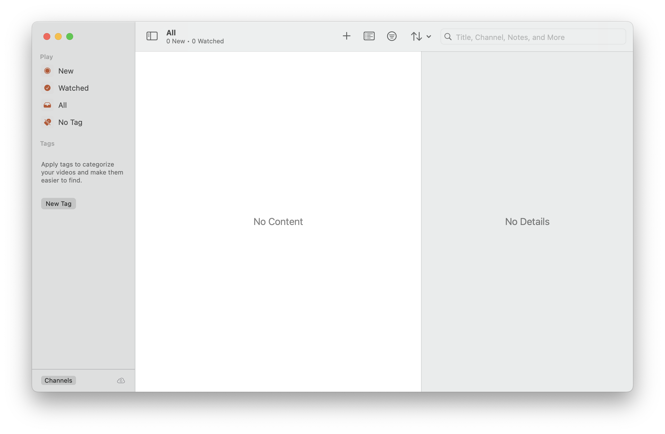 При первом запуске вас ожидает пустое окно без какого-либо обучения. Чтобы начать работу с Play, нужно нажать кнопку «+» на верхней панели и добавить интересующие вас каналы.