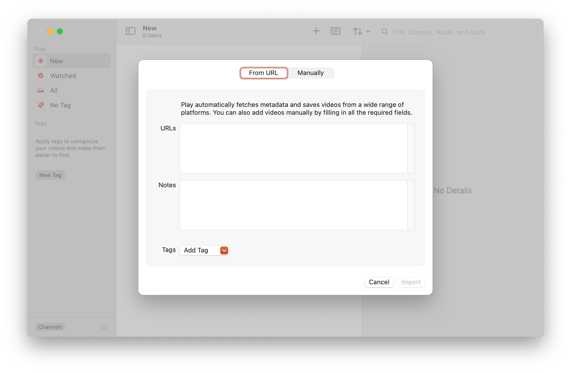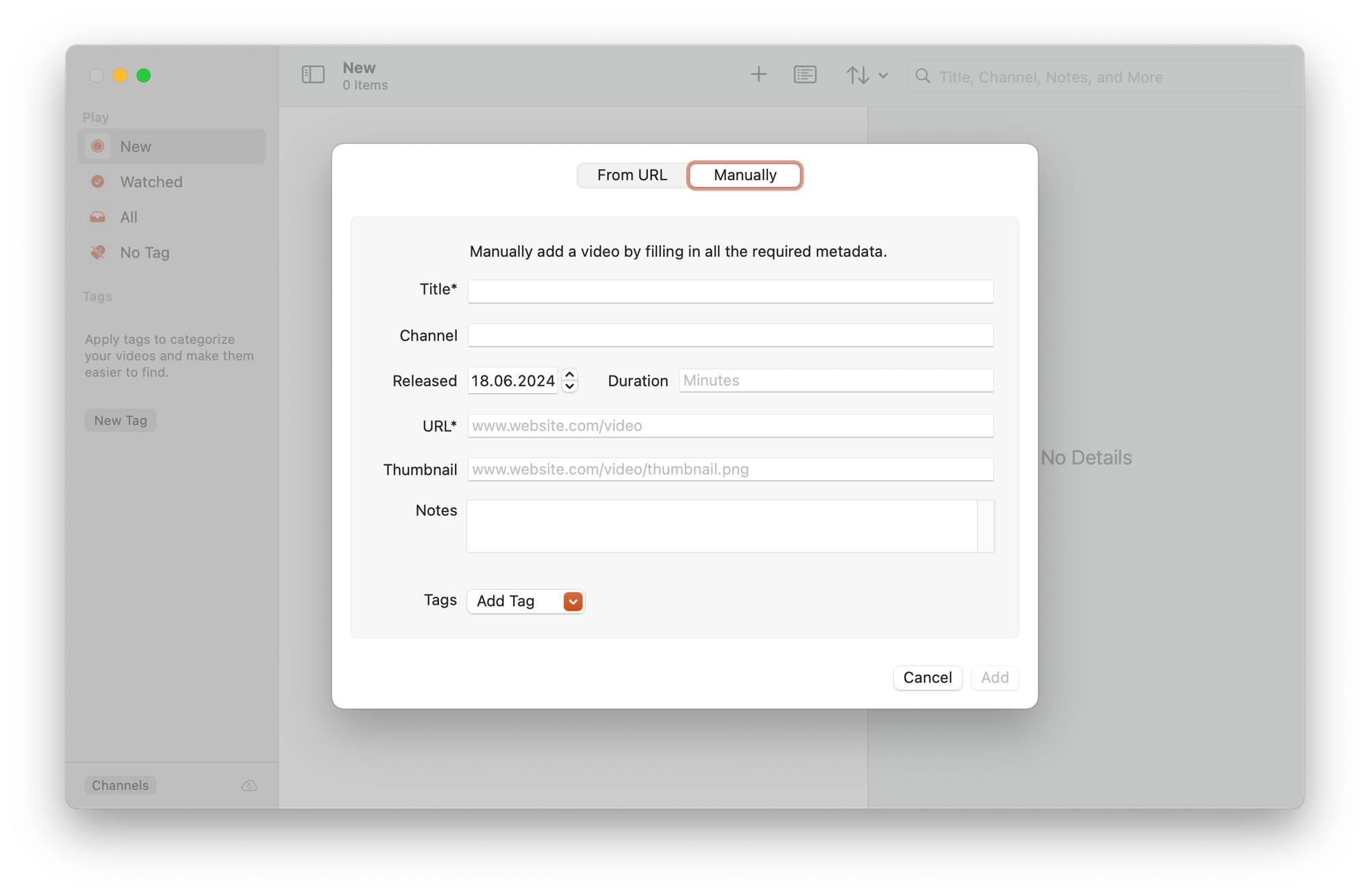 Сделать это можно двумя способами. Первый — добавить список URL, к которому можно дополнительно добавить заметку и тег. Второй — ручной, где вы добавляете видео вручную с описанием канала, названия, даты выхода и прочих описательных штук.