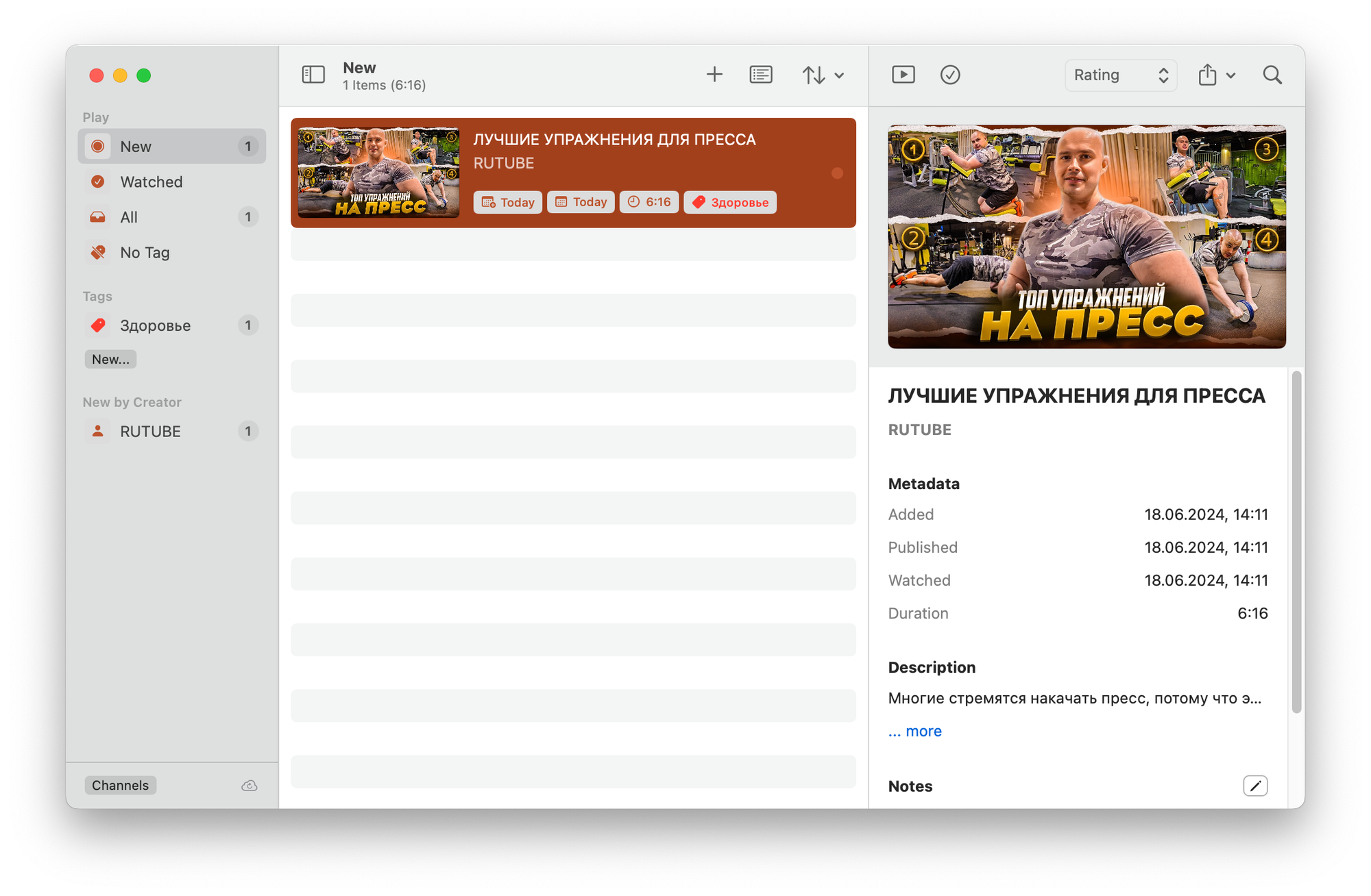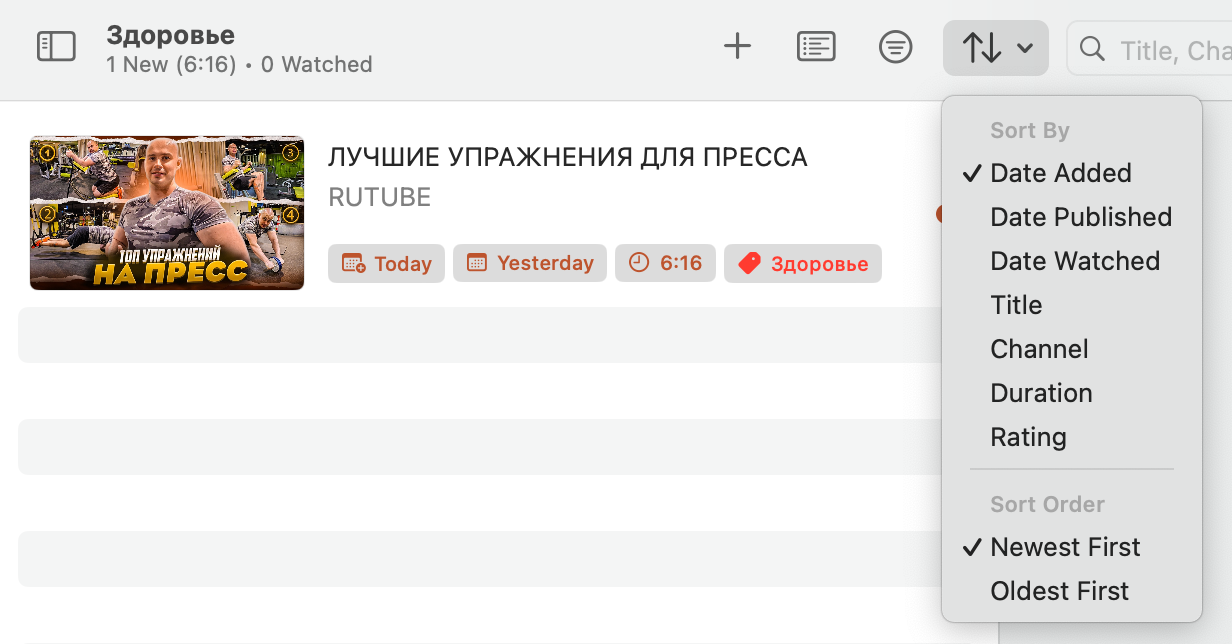 В списке видео отображается превьюшка, дата добавления, дата выхода, длительность и тег. При клике по видео можно посмотреть его метаданные, добавить или изменить заметку или теги. Кроме тегов, видео можно добавлять в папки, что повышает возможности по их организации.
