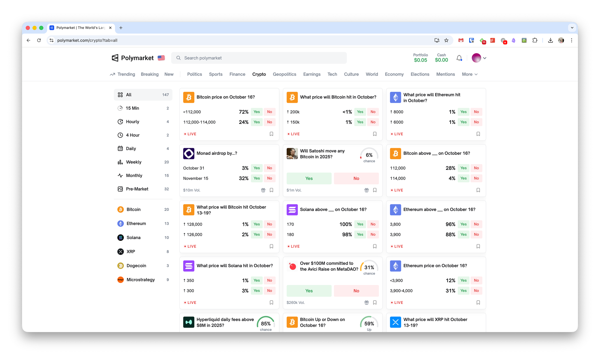 Внутри категорий также могут быть дополнительные классификации. Например, в разделе Crypto можно отфильтровать ставки по ежечасному, ежедневному результату, премаркету и прочим параметрам.