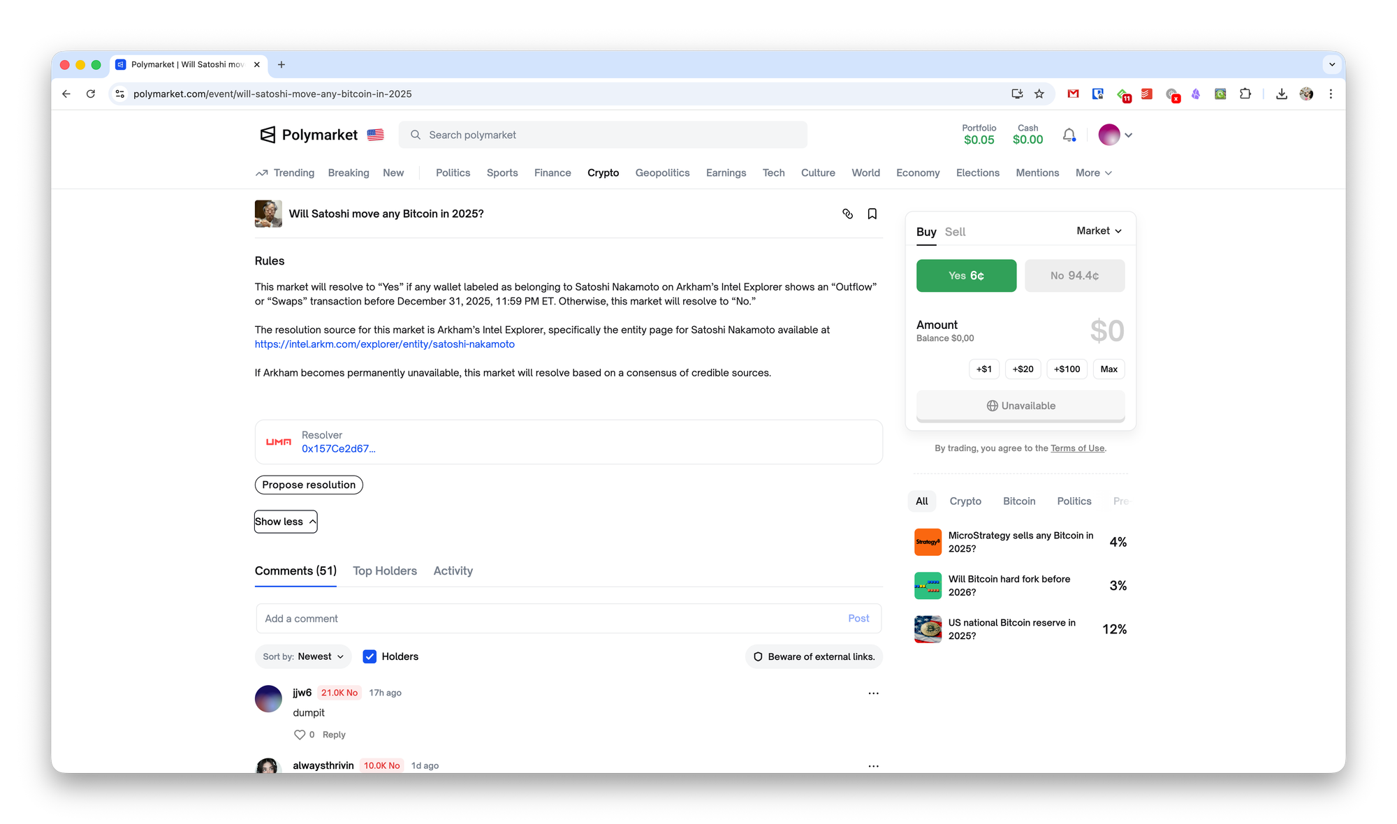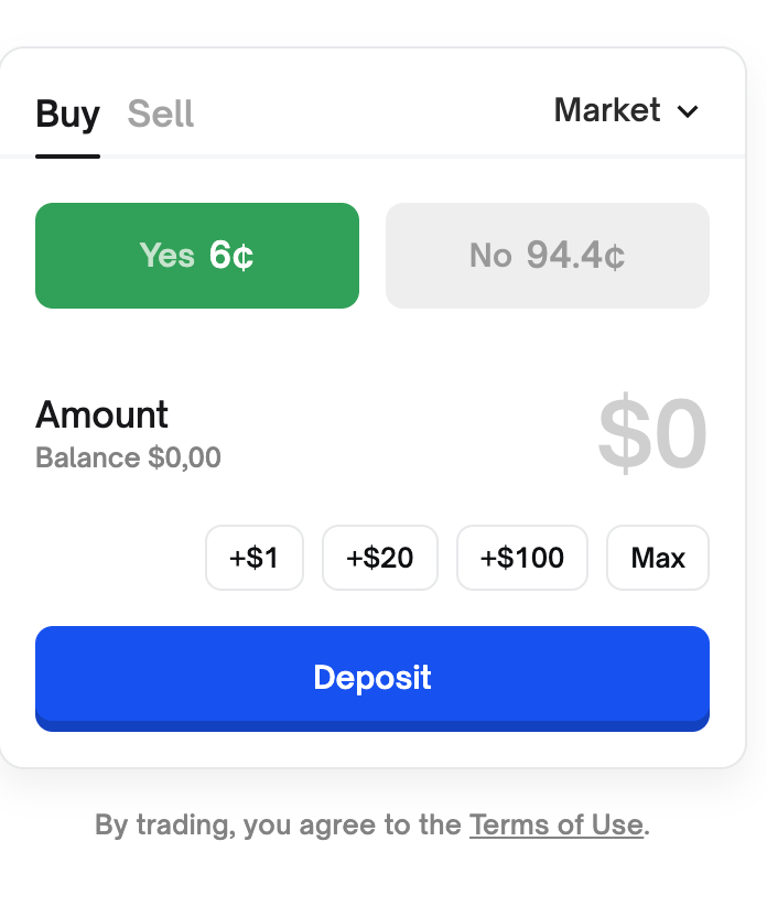 Стоимость одного голоса на Polymarket по умолчанию стоит $1. При фактической покупке стоимость зависит от текущего распределения голосов. Например, на скриншоте ниже 94% пользователей проголосовали «Нет», а остальные — «Да».