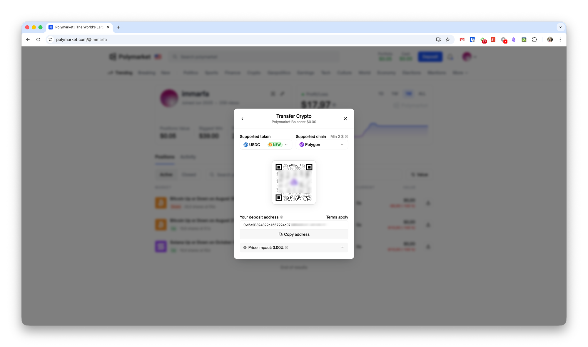 При нажатии на кнопку Deposit в правом верхнем углу можно пополнить ваш баланс на Polymarket. Способов пополнения несколько, но для пользователей из России будет актуальным только криптовалюта.
