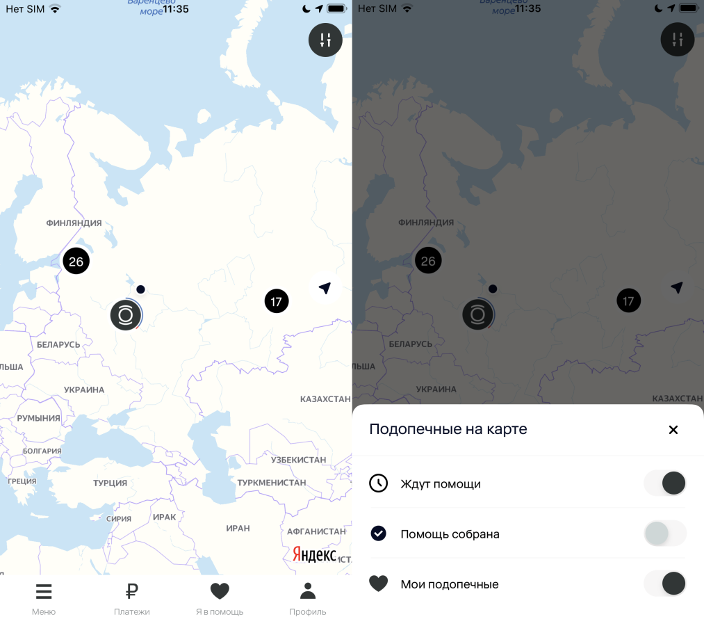 Мне немного не понравился поиск нуждающихся людей. При тапе на маркер с числом подопечных карта немного приближается, не давая никакой информации. Так приходится тапать много раз, пока не откроется хоть какая-то внятная информация.