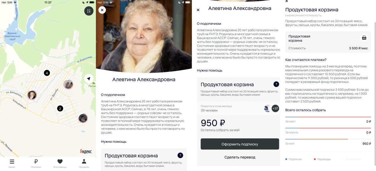 Если вы справились, то вместо иконок появятся фотографии подопечных. А при тапе по фото откроется краткая информация о том, почему именно этот человек нуждается в поддержке и на что пойдут деньги.
