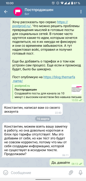Как ни странно, такие сервисы есть и называется он Постпродакшен. Поэтому я ради интереса попробовал с помощью Постпродакшен написать пост про Постпродакшен. Для этого я отправил им в телеграм вот такое сообщение: