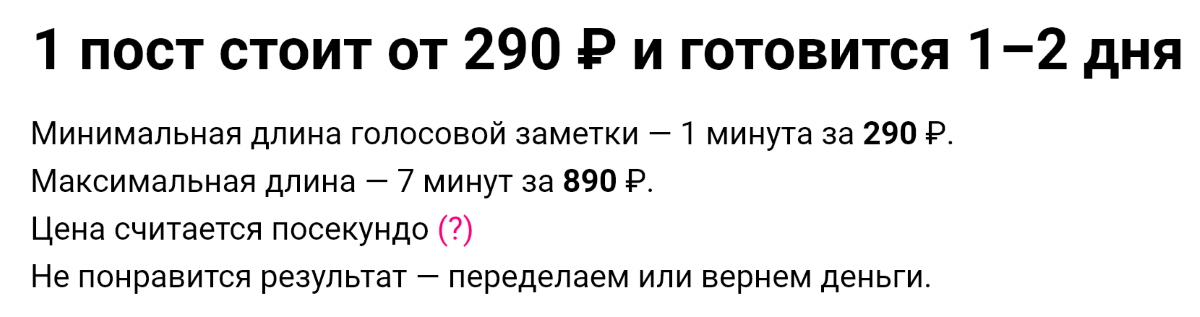 Стоимость одного поста — от 290 рублей. Это минимальная цена за голосовое сообщение длительностью в 1 минуту. Каждая дополнительная минута — 100 рублей, а итоговая цена считается посекундно.