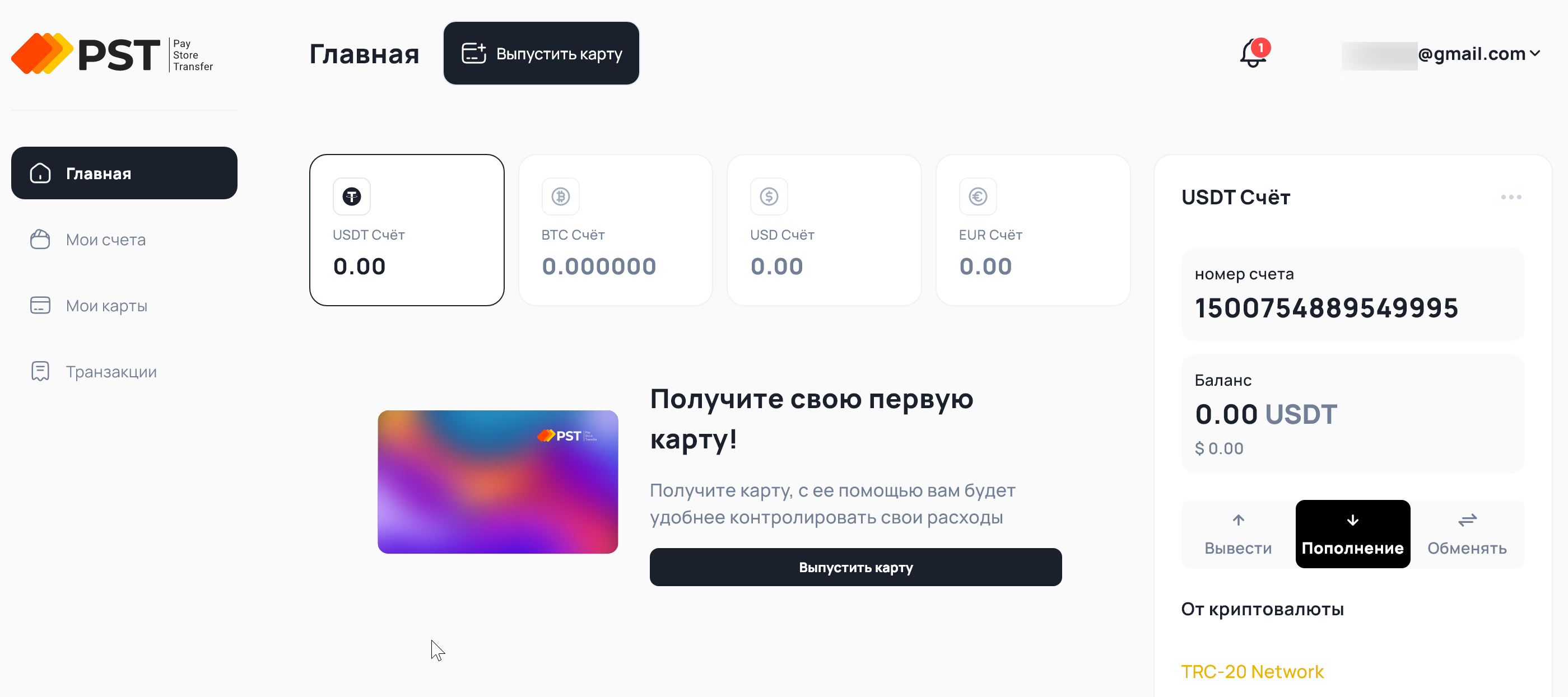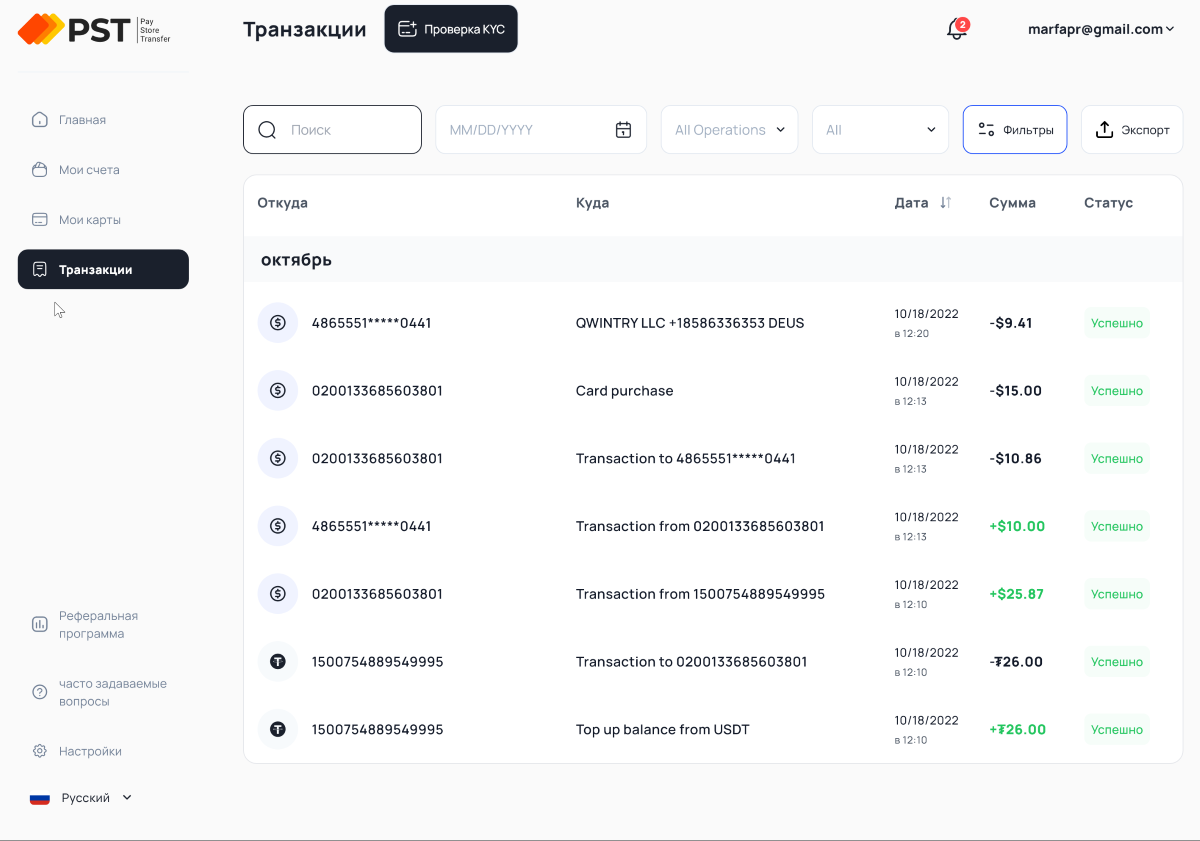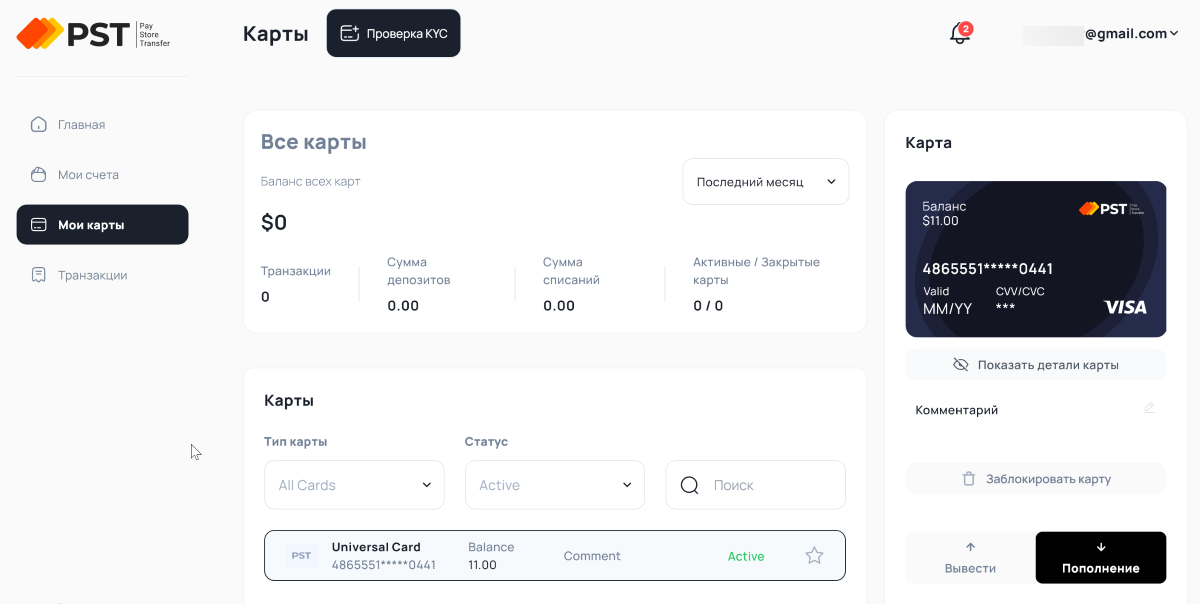 Здесь можно отслеживать баланс, транзакции, узнать детали карты, заблокировать её. А также можно вывести деньги с баланса на другую банковскую карту или счёт в системе. При выводе денег на счёт PST позже их можно вывести в USDT на любой кошелёк.