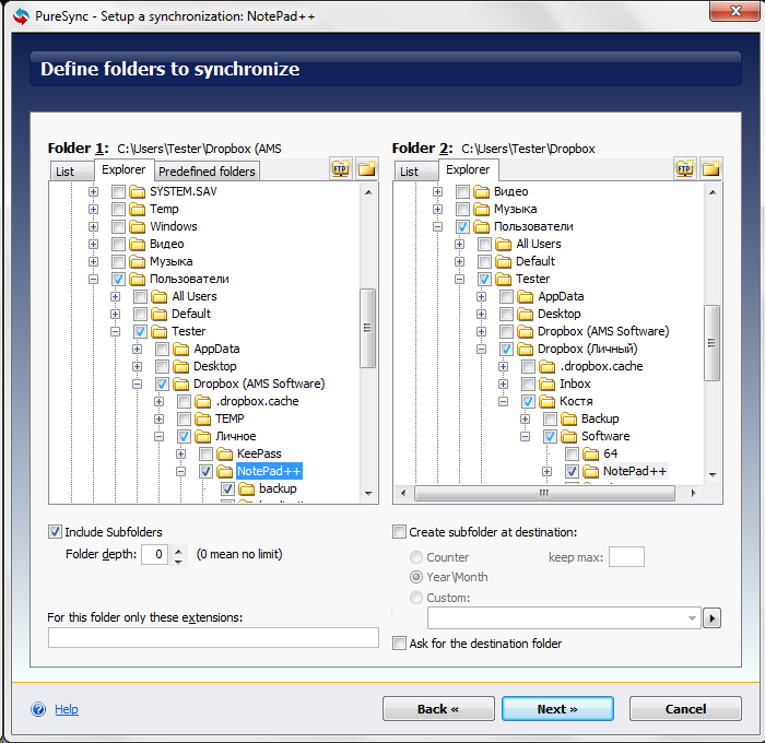 Шаг 2 - выбираем папки для синхронизации. Вы можете выбрать сколько угодно папок. Слева папки - оригиналы, справа - куда синхронизировать данные. Очень удобно, что можно настроить "глубину" папок опцией Folder Depth. Это означает насколько подпапок внутрь будет заглядывать программа. В папке назначения можно автоматически создавать папки по нужным правилам.