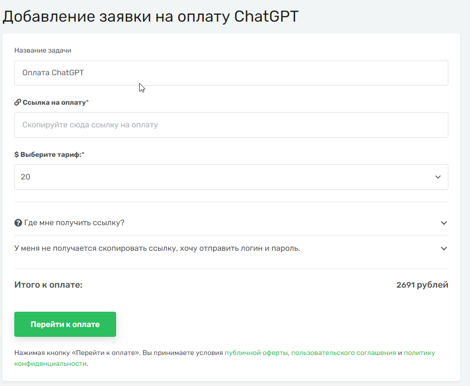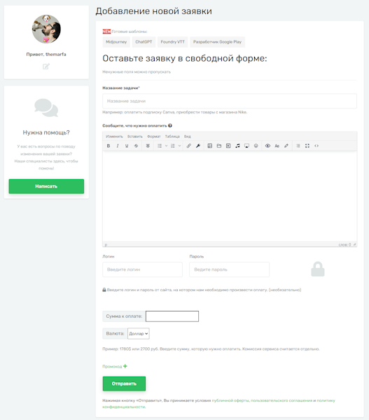 Либо можно заполнить всё вручную. Тогда от вас потребуется указать название задачи, описать, что вам нужно оплатить, при необходимости указать логин-пароль от сайта и указать сумму оплаты.