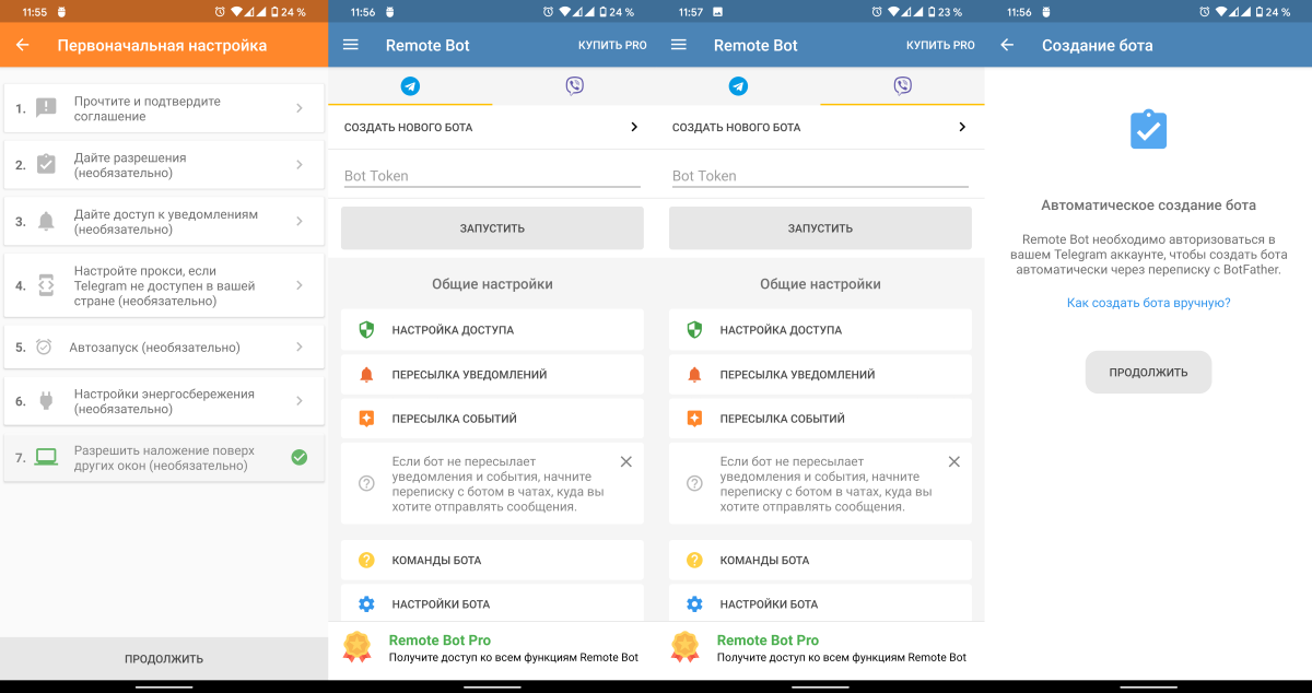 Пожалуй, самое сложное для новичка — это первый запуск приложения. Во-первых, надо будет выдать кучу разрешений. Во-вторых, создать Telegram- или Viber-бота.