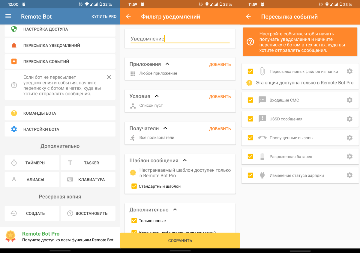 Все типы автоматизации настраиваются с главного экрана Remote Bot. Всего есть две основные настройки: пересылка уведомлений и пересылка событий.