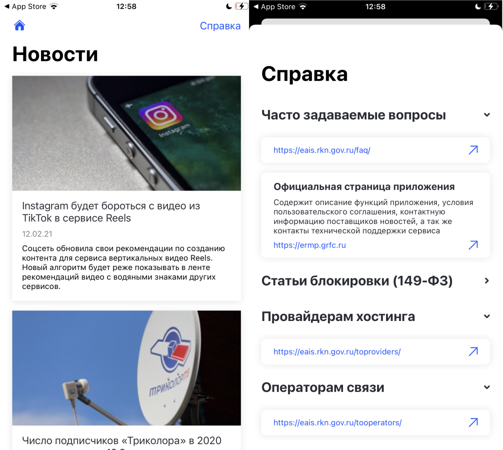 Отсюда же можно перейти в справочный раздел, где можно ознакомиться с FAQ, информацией о самом приложении, почитать статьи 149-ФЗ и получить информацию для провайдеров и операторов связи.