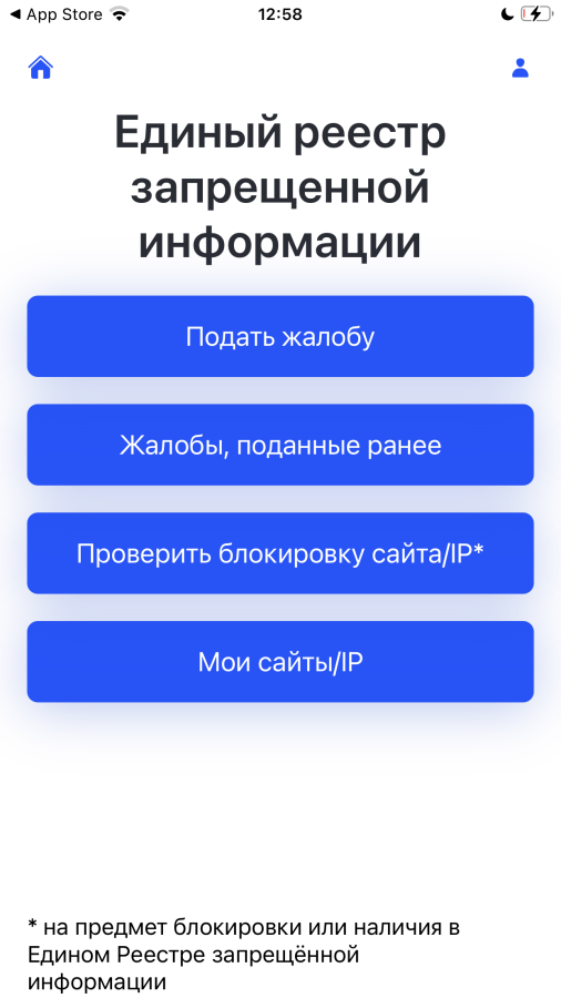 При нажатии на кнопку Единый реестр пользователь может подать жалобу, отслеживать список жалоб, проверить блокировку ресурса, а также мониторить свои ресурсы.