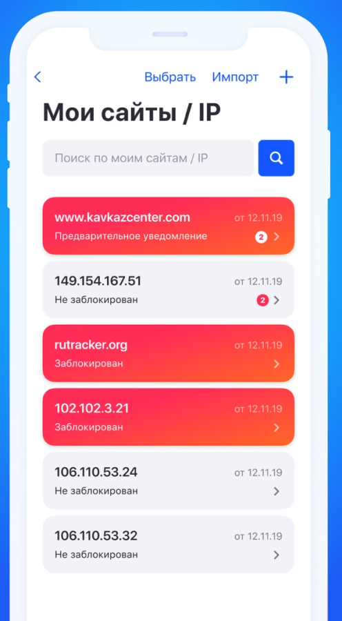 Добавленные ресурсы отображаются в списке с возможностью поиска. Для каждого ресурса доступно краткое и подробное отображение статуса блокировки.