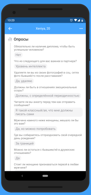 Но мне запал в душу раздел «Опросы». Вопросы в них нестандартные и довольно интересные. Например, вопрос «Удаляете ли вы фотографии бывших из соц. сетей». Ну, ведь, правда, интересно! Кстати, если ответы совпали, они будут выделены специальным цветом.