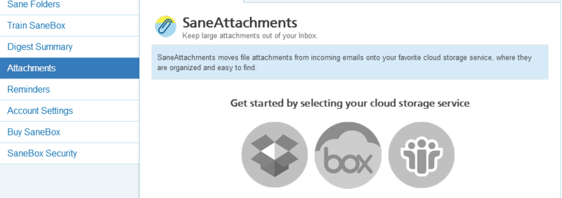 Одна из интересных возможностей SaneBox - автоматическое скачивание вложений из писем в облачное хранилище. Сейчас поддерживаются Dropbox, Box и IBM Smart Cloud. Т.к. среди хранилищ нет Bitcasa, то я этой опцией не пользуюсь. Для тех, кому нужна поддержка Bitcasa, рекомендую посмотреть на Kloudless.