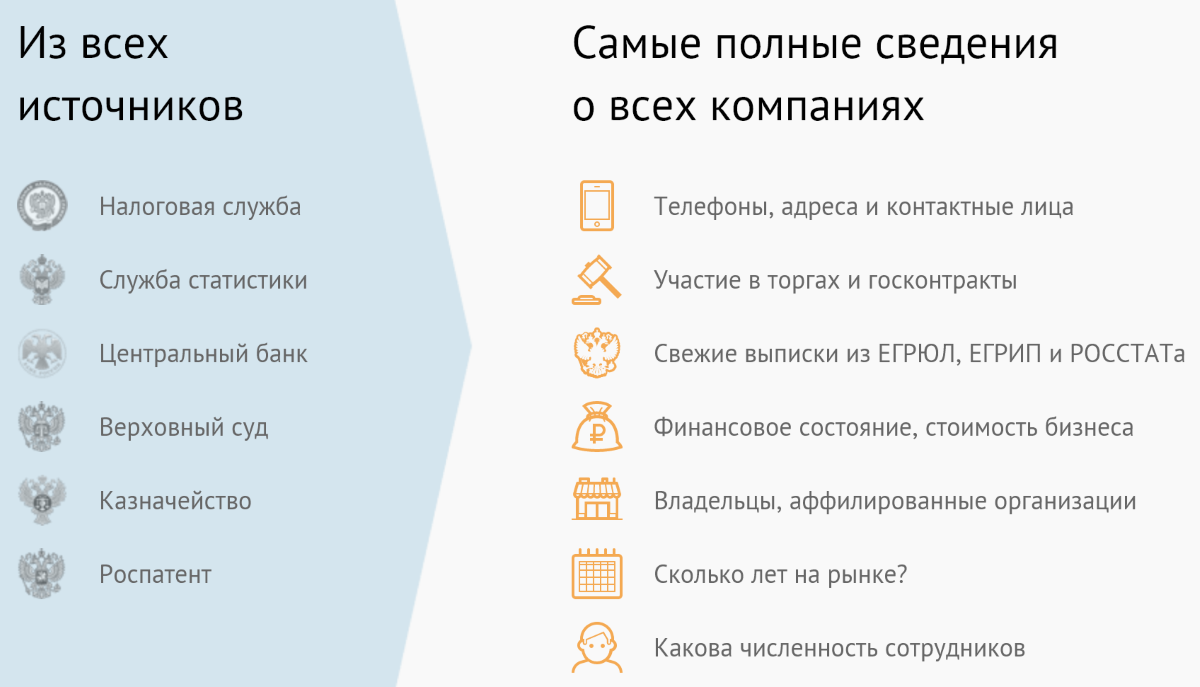 Все данные о людях и компаниях берутся в первую очередь из государственных источников, таких как: Центральный Банк, Федеральная Налоговая Служба, Единые Государственные Реестры Юридических Лиц и Индивидуальных Предпринимателей, Фонд Социального Страхования, Пенсионный Фонд, Верховный Суд, Казначейство, Федеральная служба по интеллектуальной собственности и т.д. Также информация поступает от Сбербанка, B2B-Center, Росэлторг и др.