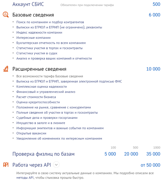 Проверка физических лиц по базам даёт возможность проверить от 100 до 1000 человек — в зависимости от выбранного пакета. Цены варьируются от 5000 до 35 000 рублей в год. Работа через API возможна при оплате от 50 000 рублей в год и выше.