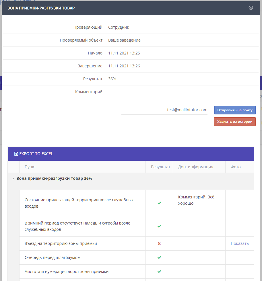 При клике на отчёт можно просмотреть результаты его выполнения, комментарии и фотографии. Также его можно отправить на почту.