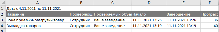Отчёты, отобранные по фильтру, можно выгрузить в Excel-файл. В нём будет содержаться лишь базовая информация о статусе завершения, проверяющем и исполнителе, датах выполнения и организации.
