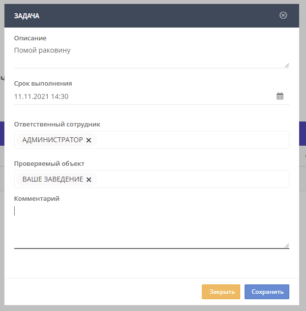 Вместо чек-листов сотруднику можно выдавать конкретные задачи. Такая задача у сотрудника отобразиться в отдельном пункте меню. Вы можете задать описание, срок выполнения, указать роль сотрудника, объект и комментарий.
