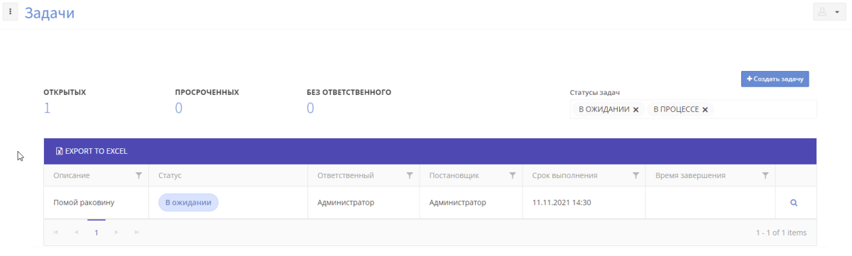 Задачи бывают в статусах: В ожидании, В процессе, Выполнена и Невозможно выполнить.