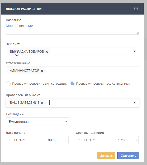 В этом разделе можно задать повторяемость для выполнения чек-листов. Как обычно, нужно указать исполнителя и проверяющего, объект и задать параметры повторяемости со сроком выполнения.