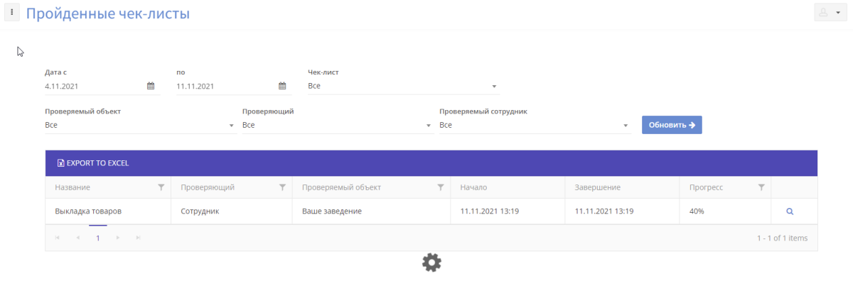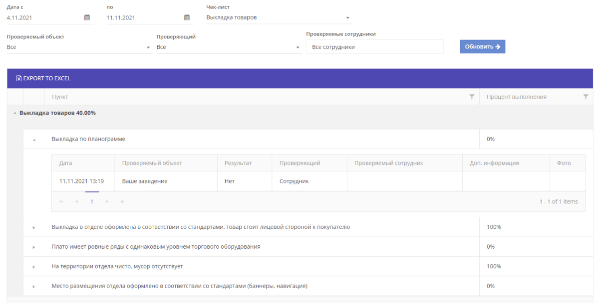 В этом разделе руководитель организации может просматривать пройденные сотрудниками списки дел. Для удобной навигации предусмотрена фильтрация по дате, типу чек-листов, проверяемым объектам, проверяющим и проверяемым должностям.
