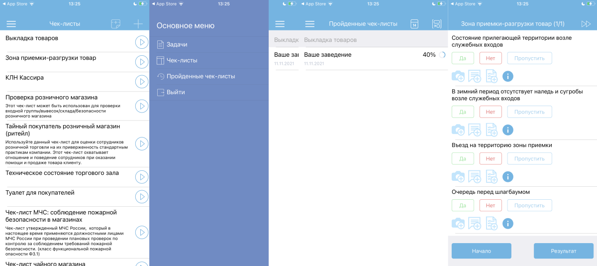 По сути от работника требуется открыть электронный список задач, пройти их и сохранить результат. Также можно просматривать уже пройденные чек-листы и выполнять разовые задачи.